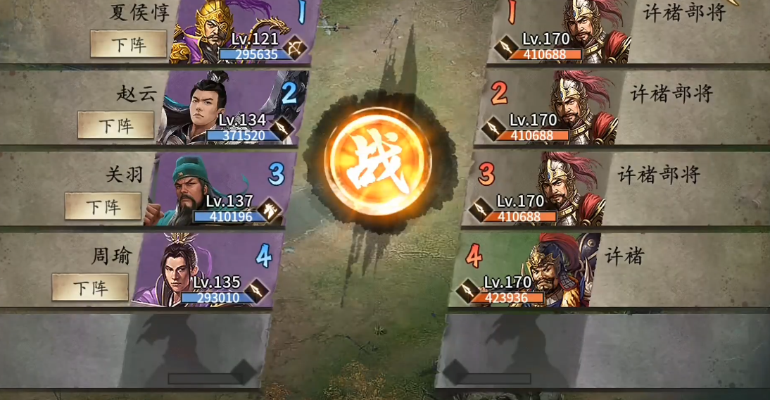 战斗开始时,夏侯惇应保留战法不放,用第一排兵力击败敌方第一位部将并承受第二位部将的战法攻击。若夏侯惇第二排兵能战术克制对方,则继续保留战法,让最后一排释放战法并承受第三位部将的攻击。甘宁应安排在第七或第八位置直接释放战法,使其第三排兵面对许褚时形成有效压制。马超的抵挡概率较高,适合放在队伍后方使用先手战法。