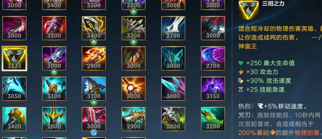 破舰者作为专为推塔设计的装备,在单带场景下表现尤为突出。其被动效果登舰小组能在英雄单独行动时提供额外抗性,并对建筑物造成20%额外伤害。该装备还能强化附近小兵的生存能力和输出效率,使兵线推进更为顺畅。对于战士或坦克类英雄而言,破舰者兼顾防御属性与拆塔速度,是分推战术的理想选择。三项之力则通过咒刃特效为普攻附加额外伤害,这种效果对防御塔同样生效,配合其提供的攻速和冷却缩减属性,能实现持续高效输出。