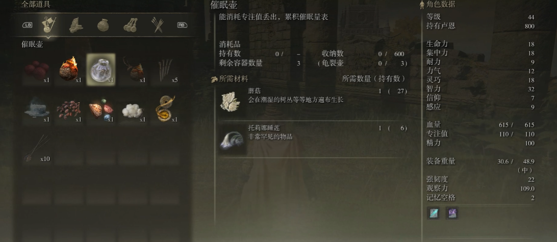 制作催眠壶需要两种主要材料:蘑菇和托莉娜睡莲。蘑菇在游戏前期很容易找到,比如在宁姆格福的树林或洞穴里经常能捡到。托莉娜睡莲则多生长在水边或沼泽区域,比如湖区的岸边或啜泣半岛的湿地。建议平时探索时多留意这些地方,顺手收集一些备用。材料准备好后,打开制作菜单选择催眠壶,消耗1个蘑菇和1个托莉娜睡莲就能完成制作。