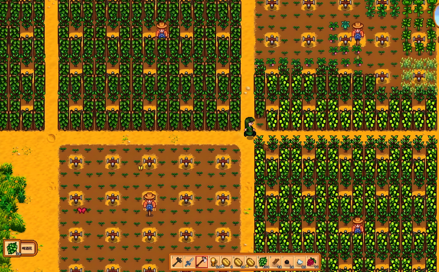 啤酒花是夏季另一个值得关注的作物,11天成熟后可每天收获,虽然需要架子和合理布局,但酿酒后的收益极高。玉米作为跨季节作物,种子价格150g,14天成熟后每2天可收获一次,夏季种植后秋季仍能继续收获,性价比很高。辣椒种子价格30g,5天成熟后每2天可收获一次,适合作为补充作物种植。