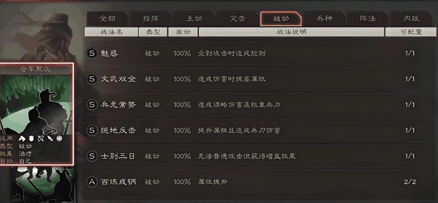 战法强化是提升武将实力的核心环节,合理选择战法能显著提高战斗效率。战法分为被动、指挥、主动、突击等类型,优先级依次为被动>指挥>主动>突击。被动战法在准备回合生效且不可被清除,适合作为核心增益;指挥战法影响全局但需注意触发时机;主动战法依赖发动概率,需搭配增益类战法提升稳定性;突击战法则受普通攻击触发,易被缴械克制。强化时应优先升级主力武将的自带战法,再根据阵容需求补充传承战法。