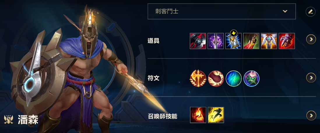 潘森在英雄联盟手游中定位为战士/刺客,前中期作战能力极强,凭借高爆发和控制技能能快速建立优势。核心装备以穿甲和半肉为主,兼顾输出与生存能力。推荐神装为黑色切割者、幽梦之魂、正义荣耀、死亡之舞、守护天使及斯特拉克的挑战护手。黑切提供破甲与坦度,幽梦增强机动性,死亡之舞提升吸血与容错,复活甲和血手则进一步保障团战存活率。