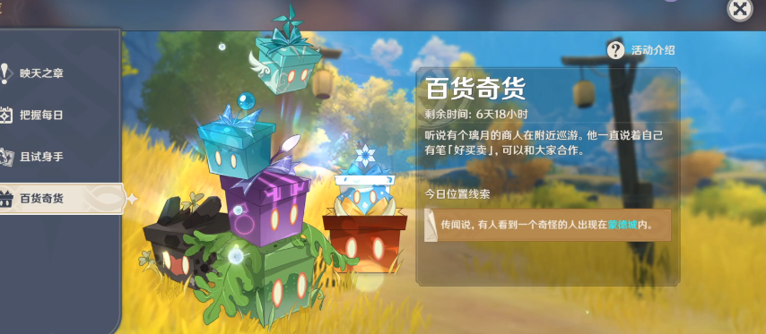 找到百货奇货商人其实很简单,这位名叫立本的商人每天都会在提瓦特大陆的不同位置出现。活动期间,咱们可以通过活动页面查看他当天的具体位置提示,通常会在蒙德城、晨曦酒庄、清泉镇或望舒客栈这些地方转悠。比如第一天他可能站在蒙德城花店对面,第二天又跑到清泉镇的杂货摊旁边,第三天或许在晨曦酒庄后门晃悠。每天凌晨四点后位置会刷新,记得根据线索去找他哦。