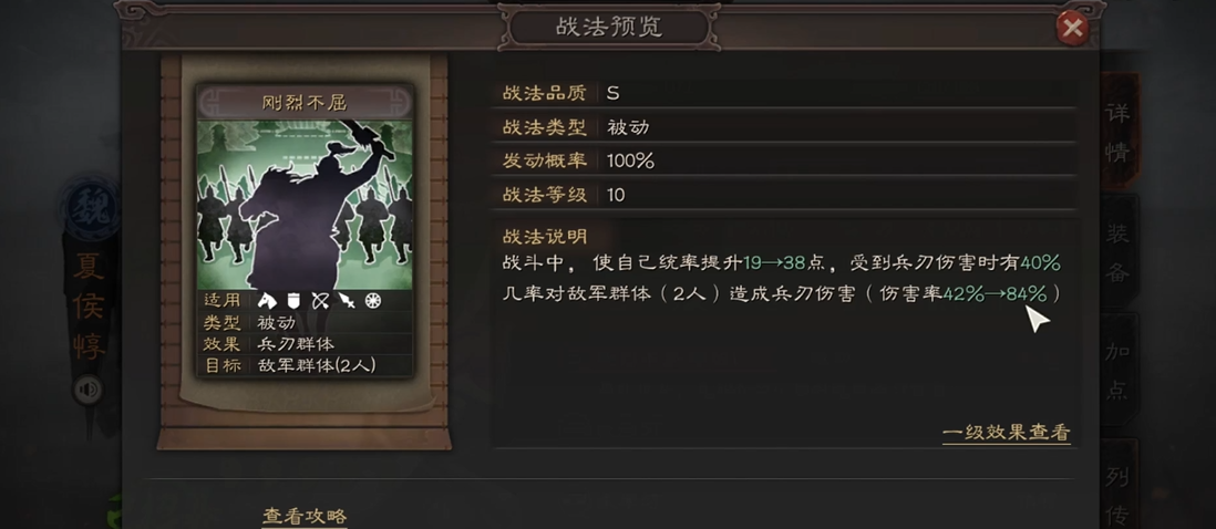 他的核心战法刚烈不屈让他成为开荒和反击流的强力武将。这个战法不仅能提升自身统率,还能在受到兵刃伤害时反击敌人,非常适合承担伤害并反打的战斗风格。骑兵的高机动性搭配反击效果,能让他在前期快速发育,节省兵力消耗。
