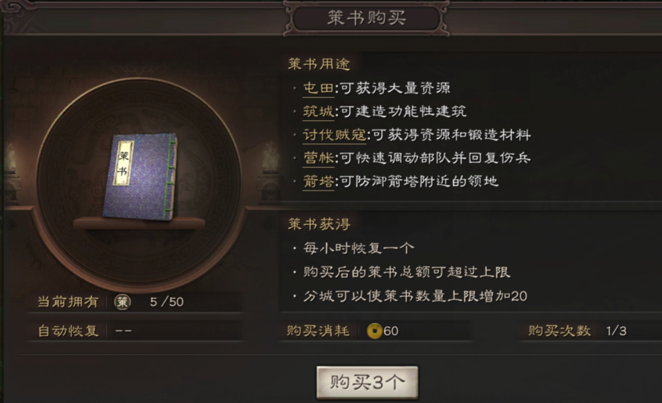 建议优先保证每天买满3次,这样不会浪费购买次数。如果发现策略书快满了,赶紧用掉,比如屯田或者讨伐,别让它白白溢出。建分城不仅能增加上限,还能多一个资源产出点,长远来看更划算。策略书是每小时恢复1本,所以算好时间,别让它一直满着不动。