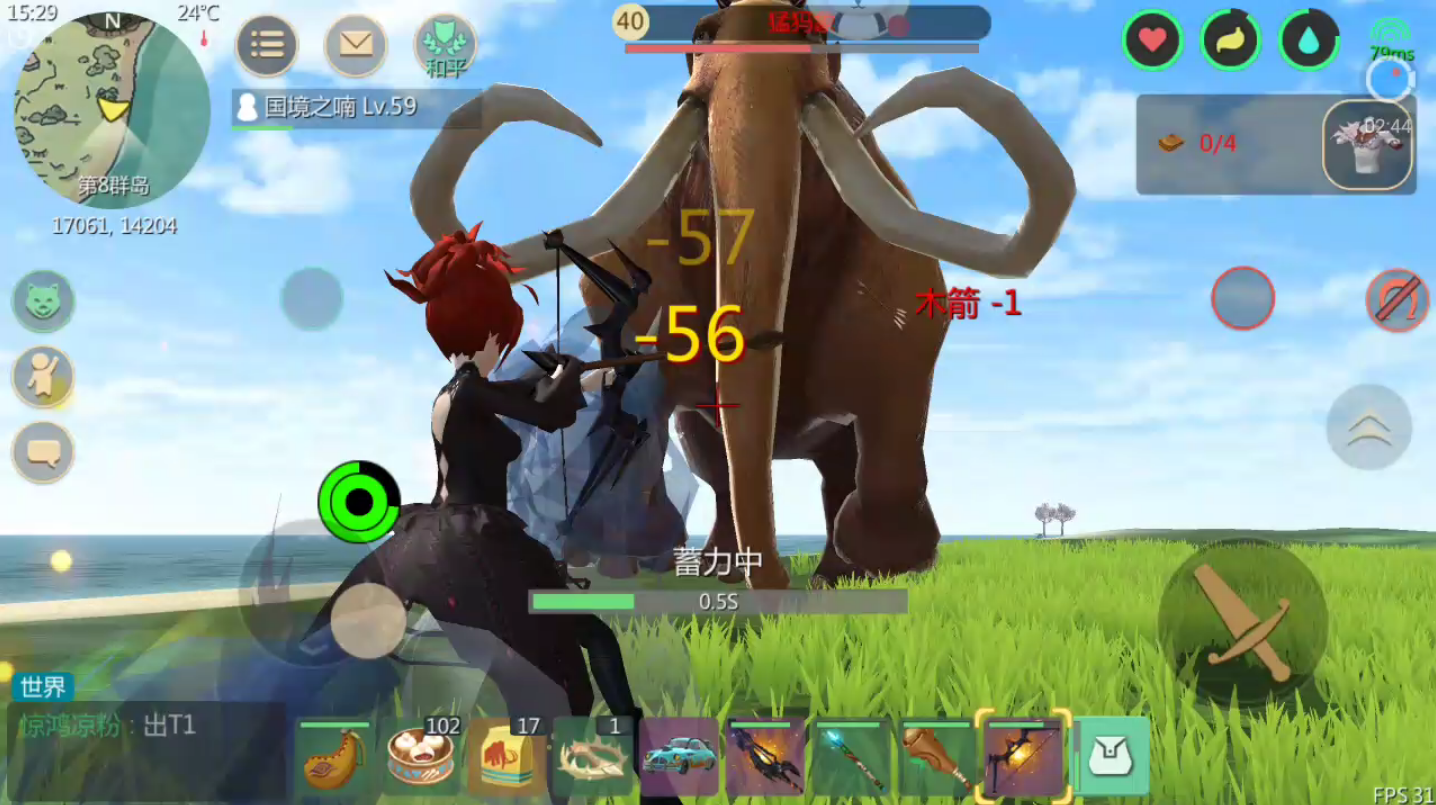 找到猛犸象后,先在它面前插个篝火。篝火属于安全区,咱们可以用弓箭射它,猛犸象会逃跑。这时候追着它继续射箭,直到离开篝火范围。注意保持距离,猛犸象离开篝火后会掉头攻击,这时候边射边往篝火跑,回到安全区后它又会逃跑。重复这个风筝战术能安全消耗它的血量。