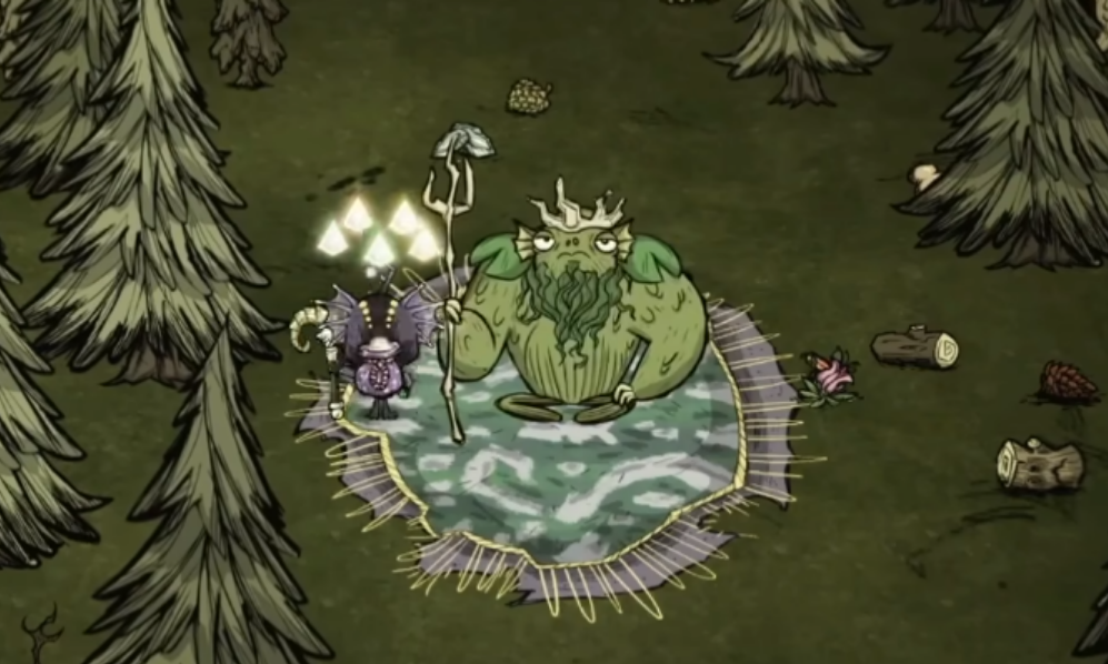 鱼人王的召唤条件较为严格,需由角色沃特在沼泽地形建造皇家手工套装,并消耗公牛海带、猪皮和牛毛等材料生成皇家地毯。附近鱼人会自动登上地毯,连续喂食素菜使其饱食度超过50即可加冕为鱼人王。鱼人王需要定期投喂维持存在,一旦饿死则所有增益效果消失,包括沃特的三围提升和鱼人守卫的生成权限。