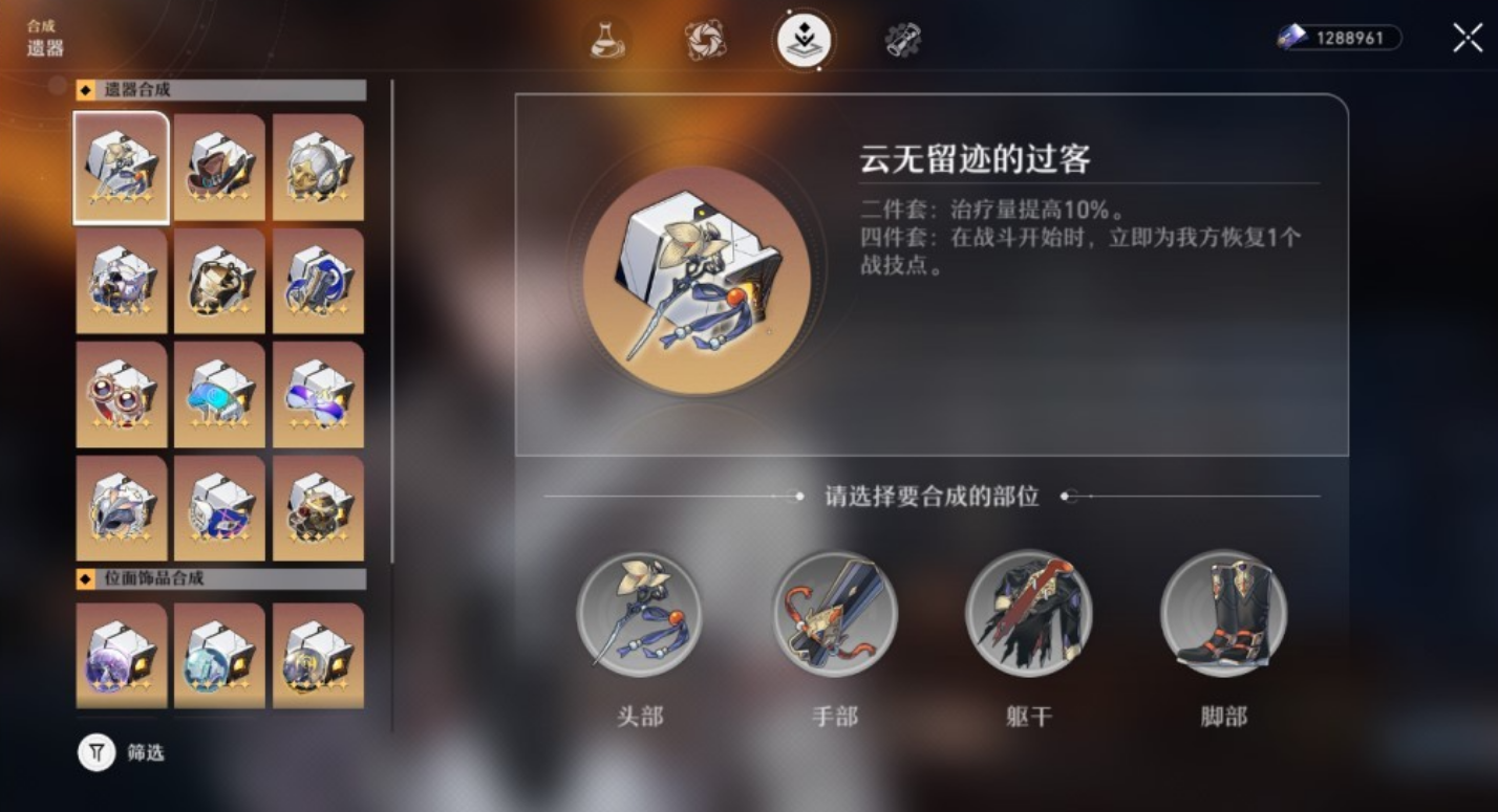 遗器合成是崩坏星穹铁道中提升角色战力的重要途径,主要通过分解冗余遗器获取材料,再定向合成目标装备。解锁该系统需要达到均衡等级3或开拓等级40级,合成功能位于游戏菜单的合成界面。每次合成需消耗10个遗器残骸(分解1个五星遗器可获得10个残骸)和一定信用点,支持选择套装类型及部位,但主词条仍随机生成。若需指定主词条,则需额外消耗稀有道具自塑尘脂,该道具主要通过无名勋礼(通行证)免费获取,每个版本限得1个。