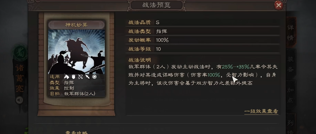 诸葛亮的核心战法推荐夺魂挟魄与杯蛇鬼车,前者能削弱敌方属性并强化自身,后者提供谋略伤害与治疗,契合其攻防一体的定位。若作为辅助型输出,可携带无当飞军提升弓兵部队的统率与速度,或选择料事如神降低敌方伤害。拆解战法舌战群儒同样具有战略价值,能干扰敌方主动战法发动概率并提升友军触发几率,适合搭配高发动率的武将如周瑜或程昱。