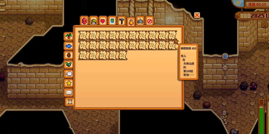 星露谷物语秘密纸条10的获取需要玩家深入骷髅洞穴第100层,这是游戏中最具挑战性的收集任务之一。该纸条记载了齐先生在骷髅矿洞100层等待玩家的信息,触发条件为完成冬日谜团任务并获得放大镜。获得纸条后,玩家需抵达骷髅矿洞100层,期间齐先生会根据玩家使用楼梯的数量给予不同评价,最终奖励为永久提升25点生命值的铱金蛇奶。即使未获得纸条前使用楼梯也会被计入统计,影响最终对话内容。
