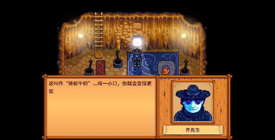 骷髅洞穴的进入需要先获得头骨钥匙,该钥匙需通过普通矿洞120层获取。抵达骷髅洞穴100层时,系统会强制播放过场动画:若玩家使用楼梯少于10个,齐先生会称赞光荣的方式;超过10个则会受到责备。此判定与是否已持有秘密纸条10无关,即使到达99层才获得纸条,先前使用的楼梯仍会计入统计。完成事件后获得的铱金蛇奶具有永久性增益效果,但需注意该奖励仅在持有纸条时才会触发。