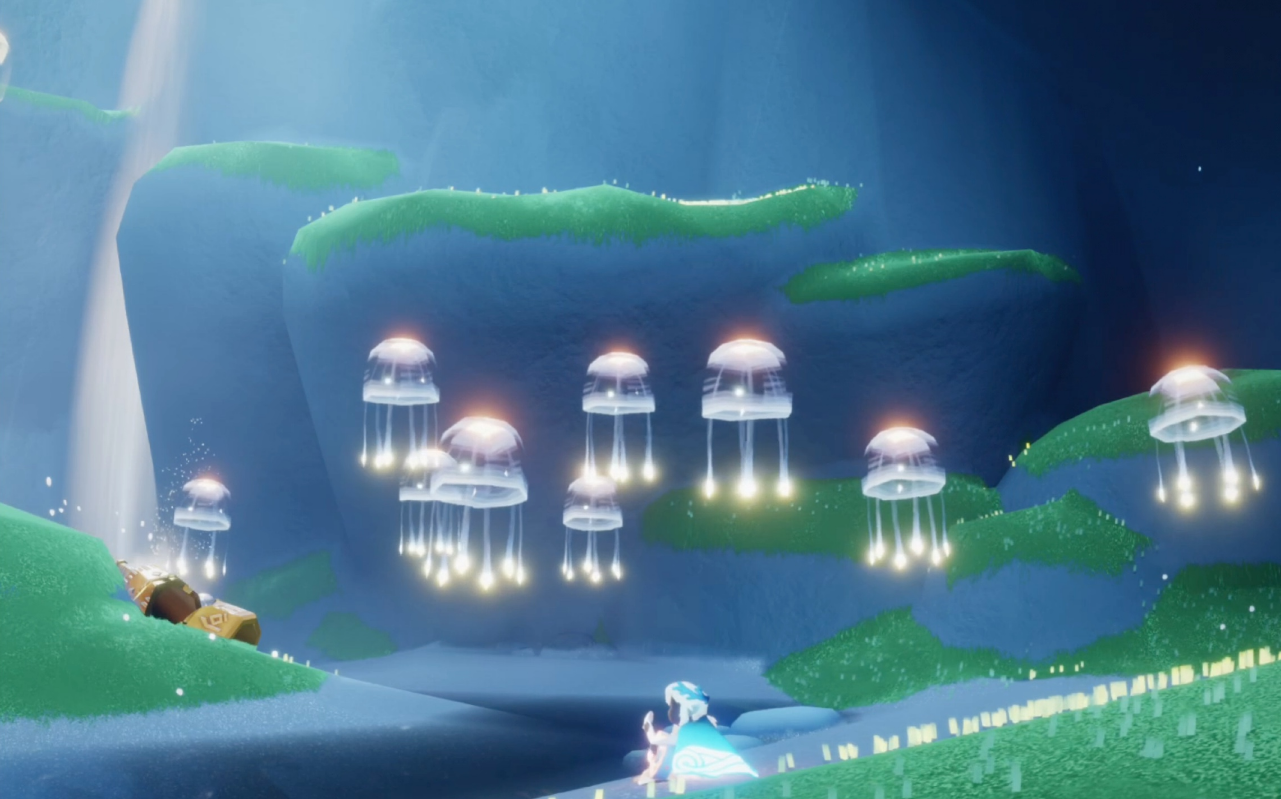 水母亭不仅是任务地点,也是重要的充能场所。完成在水母上恢复能量任务时,需要先将斗篷能量完全耗尽至小火苗状态,再接触水母即可完成任务。水母亭的水母群比其他区域更密集,是理想的充能点。圣岛季的水母洞和重生之路的水母也能完成该任务,但雨林水母亭是最便捷的选择。