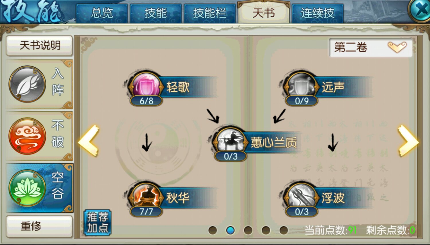 辅助流云梦的技能加点需要围绕团队需求展开。第一重优先点满奇韵和丰沛,提升基础治疗能力;第二重重点加木灵缚和枯木逢春,增强控场和持续回复;第三重则选择山外清音和春风化雨,大幅提升团队防御和爆发治疗。移花接木只需1级用于解控,其他点数全部分配到辅助技能上。天书选择空谷流派,能有效提升春风化雨的免疫效果和治疗量,同时降低技能冷却时间,让治疗节奏更加流畅。