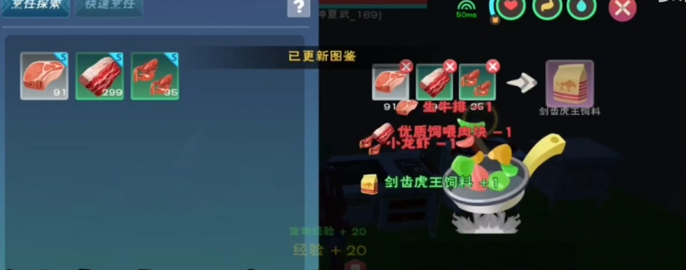 它的饲料需要小龙虾、牛肉和优质肉,至少准备18包才够用。小龙虾可以在水域边钓到,牛肉和优质肉则需要击败野外的牛类生物获取。饲料的制作方法很简单,把材料放进烹饪锅点击开始烹饪就行。如果咱们想抓普通的剑齿虎,饲料配方会稍微不同,需要小龙虾、牛排和饲喂肉,保底13包。