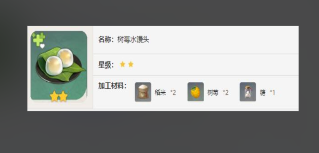 要获取树莓水馒头食谱,玩家需前往稻妻城的木南料亭,与店主木南杏奈对话并购买。该食谱为二星料理,需消耗稻米、树莓和糖三种材料制作。树莓水馒头的主要效果是为角色提供即时生命值恢复及持续治疗效果,是探索和战斗中的实用补给品。