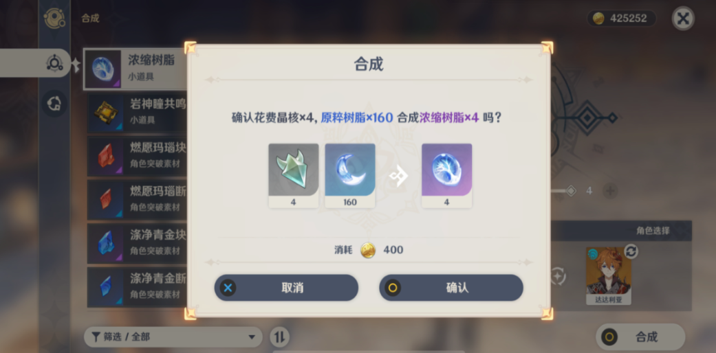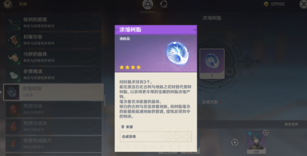 打开合成台界面后,在炼金选项中找到浓缩树脂的合成选项。确认材料数量充足后点击合成按钮,系统会提示消耗40点原粹树脂和1个晶核。需浓缩树脂的持有上限为3个,超过上限后将无法继续合成。建议合理安排合成时间,避免因达到上限导致树脂自然恢复的浪费。