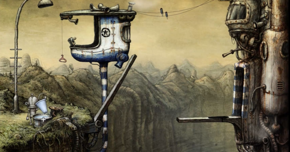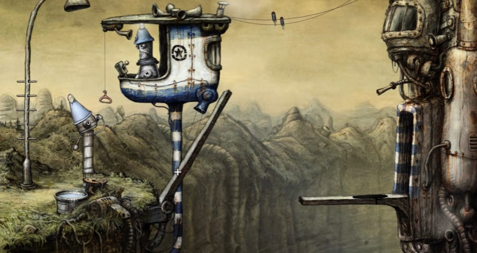 走到路灯旁,点击铁栏杆开始攀爬。爬到一半高度时,记得把最下面的铁棍抽出来插到上方继续爬。到达顶端后伸长身体就能拿到灯泡。把灯泡装在头上,再戴上刚染好的蓝帽子,这样就能完美伪装成守卫认可的机器人了。这时候拉动吊环,守卫就会乖乖放桥啦。