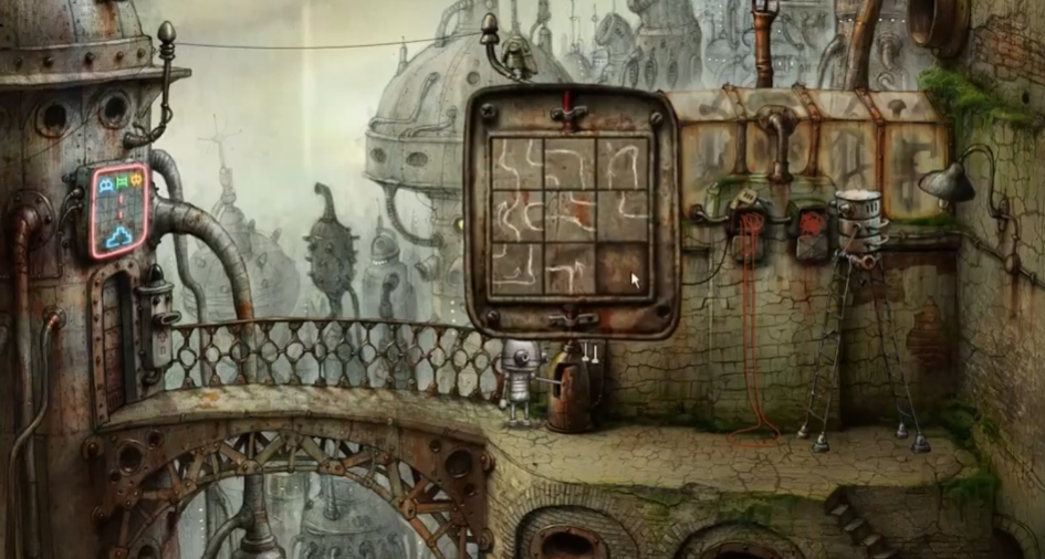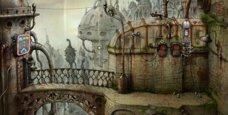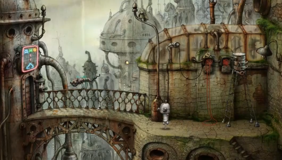 从大妈旁边的楼梯上去后,会发现一个长腿梯子机器人正在检修线路,需要先顺着它的梯子尝试抓猫,但会发现高度不够。这时必须拔掉机器人的电源插头,待其返回插电时迅速扯动红线,使检修线路的机器移动到另一侧清理线路,为后续操作创造条件。