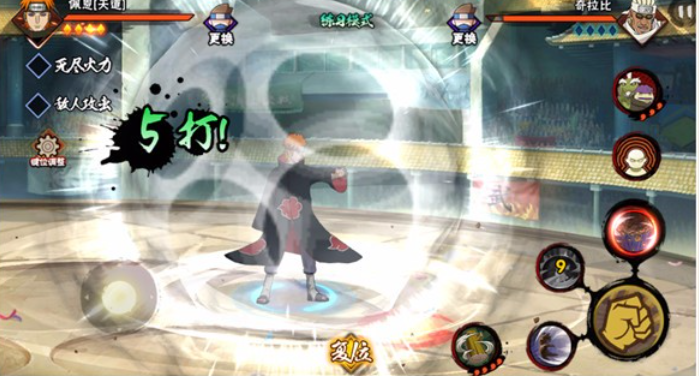 佩恩的普攻节奏感很强,尤其在墙角时能打出高连击。第五段普攻的击飞效果是连招的关键,可以接技能或者继续平推。如果对手被逼到墙角,可以用普攻起手,接着用万象天引抓取,然后接神罗天征打满伤害。神罗天征的无敌帧还能帮你躲掉一些关键技能,所以别光想着输出,灵活运用它的无敌效果能让你在决斗场更游刃有余。