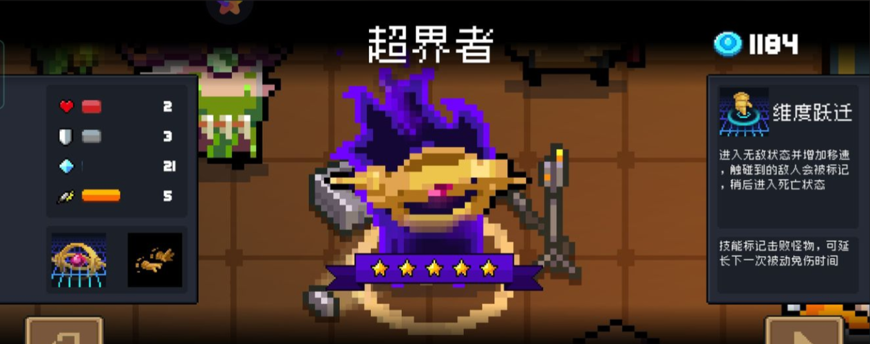 超界者这个角色相当特别,血量只有2点,护盾3点,法力值21点,属性看起来很低但能力很强。初始武器是次元之握,虽然攻击力显示只有3,但攻击频率高、距离远,还能无视地形障碍,找个掩体就能安全输出。天赋是有概率免疫伤害,虚化时完全不受伤害,配合好走位能在弹幕中穿梭。