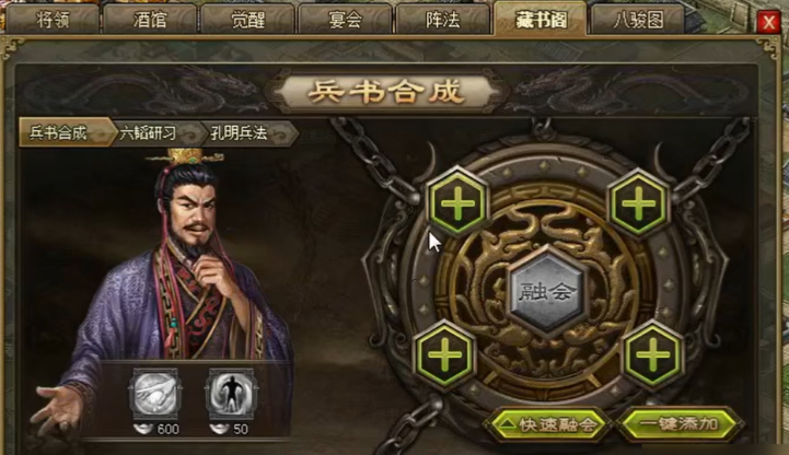 六韬兵书是提升武将战力的核心系统之一,其研习过程需通过藏书阁界面完成。首先进入武将界面,点击藏书阁选项,随后选择六韬研习功能。界面中央会出现卡槽,点击后选择需要合成的六韬兵书碎片。若碎片不足,则无法进行合成操作。合成需消耗对应等级的普通兵书作为材料,系统会提示所需兵书类型与数量,务必确保材料匹配,否则无法完成合成。六韬兵书为双属性加成,效果显著优于普通兵书,因此优先获取并升级是战力提升的关键路径。