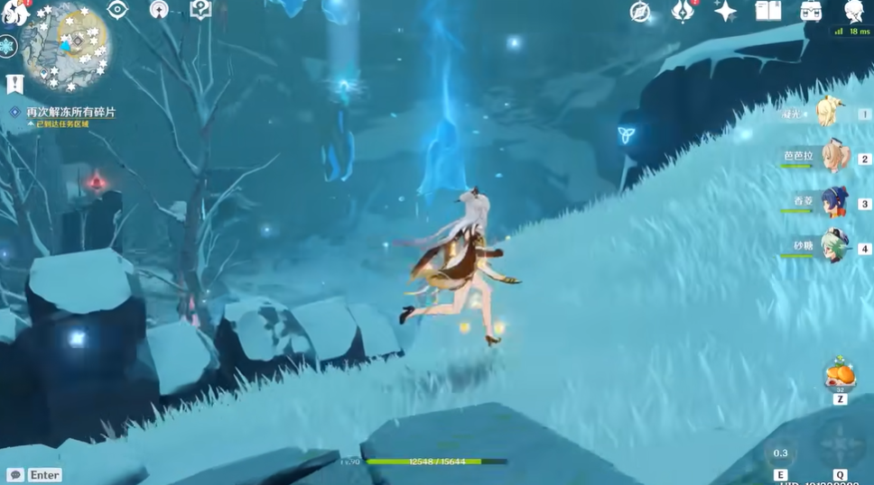 第二块碎片位于眠龙谷左下传送点附近的祭坛区域。这里需要先启动机关激活五个冰柱,并按照仙灵飞行的顺序点亮冰柱。完成解谜后,击败三个遗迹守卫,进入洞穴找到四块深赤之石,用同样的方式解冻碎片。这一区域的解谜和战斗难度较高,建议提前做好战斗准备。首次进入需要通过洞窟左上传送点右侧的祭坛进入底层。这里需要完成限时挑战,击败所有怪物后护罩会消失,随后找到深赤之石解冻碎片。洞窟地形复杂,建议携带火元素角色应对寒冷环境。