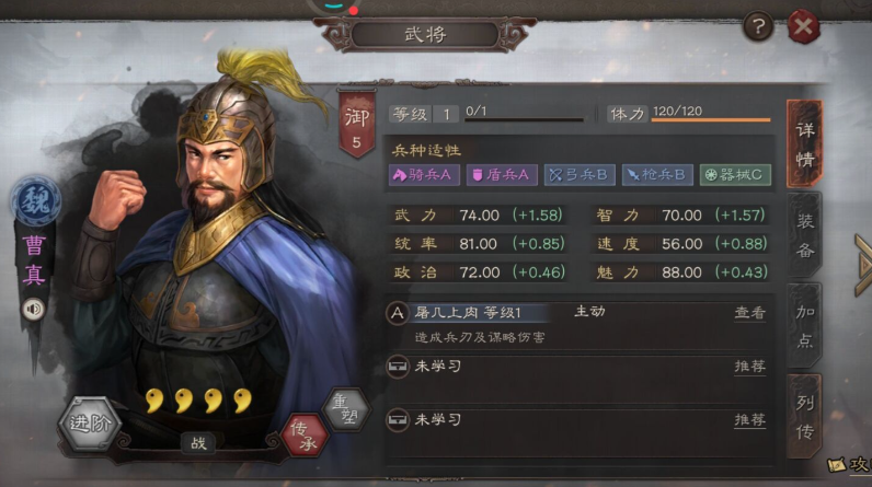 关于李典的培养,技能加点的优先级非常明确,应优先点满自带战法长者之风,以最大化团队增益。属性加点方面,主要推荐增加统率来提升防御,也可以部分增加智力以增强辅助效果的稳定性,在极早期开荒时临时加点武力帮助打地也是可行的,但进入游戏中期后建议重置回归防御向加点。他的兵种适应性盾兵为S级,器械为A级,这意味着他不仅是前期开荒队的成员,后期也可以作为攻城器械队的辅助人选。