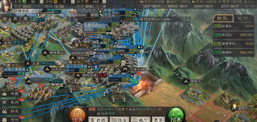 在决定攻打上洛之前,需要进行大量的侦察工作,摸清守军的配置和敌方可能存驻守情况。主力队伍的等级和战法配置必须到位,确保拥有能稳定击败守军的战斗力。器械部队是拆除城墙耐久的关键,需要提前训练好足够数量且配置合理的器械队伍。资源储备也要充足,保证有持续的粮草和预备兵支持长时间作战。最好在目标附近建立营帐或要塞,这能极大缩短部队调动时间、减少士气消耗,并提供临时的征兵点,是持久作战的必要保障。