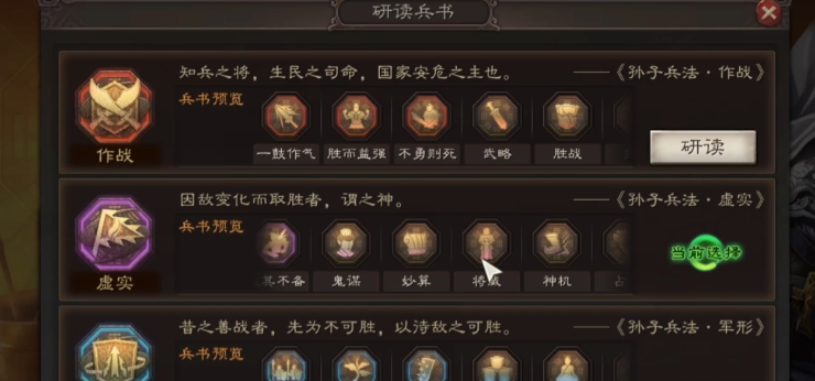 兵书本身也分为不同的类型,给你的武将领到了课本,还得帮他选对专业方向。兵书主要分作战、虚实、军形、九变四大类,每种类型侧重的强化方向完全不同。作战兵书主要强化普通攻击和突击类战法,适合依赖平砍和突击打伤害的武将;虚实兵书则侧重于提升主动战法的威力;军形兵书是增加防御和减伤能力的,适合前排肉盾;九变兵书则偏重辅助和功能性。你选择的第一层主兵书,就决定了后续强化的路线和可选的子技能。在选择时,一定要根据武将自身的定位和整个队伍的需求来搭配,比如一个纯粹的坦克武将,你给他点增加输出的兵书收益就很低,不如点防御类的让他更扛揍。