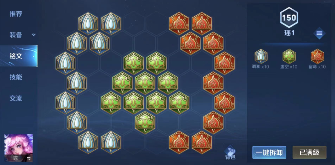 铭文推荐使用增加生命值和冷却缩减的组合,技能加点优先升级二技能,标准铭文配置为10宿命、10调和与10虚空,提供最大生命、移速和冷却缩减属性,技能方面主升二技能以增强清线与输出能力,副升一技能强化控制,大招则用于附身队友提供护盾。