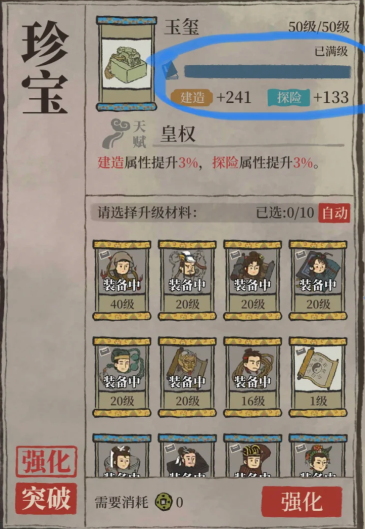 要进行珍宝突破,必须满足明确的前提条件,首要一点是当前珍宝的等级必须达到当前阶段的上限。游戏中珍宝的初始满级为10级,当强化至10级后便会提示已达上限,此后每当等级达到10级、20级、30级和40级时,都需要进行一次突破操作,珍宝的最高等级上限为50级。除了等级要求,每次突破都需要消耗一个完全相同的珍宝以及一定数量的铜币作为材料,这是突破过程中不可省略的资源代价。
