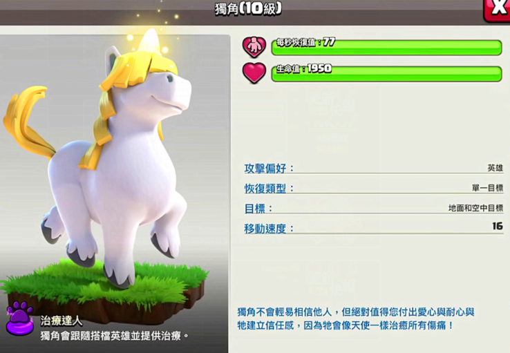 当你初入14本,最先接触到的战宠共有四只。莱希是一只机械狗形态的地面宠物,其特点是能够无视城墙,直接攻击英雄锁定的最近目标,这种能力在需要快速切入阵型内圈时非常有用。闪枭是一只猫头鹰形态的飞行宠物,它的攻击方式是释放连锁闪电,可以同时攻击地面和空中的单位,并且不会触发空中陷阱。大牦则是一只强壮的牦牛,作为地面单位,它的核心技能是对城墙造成额外伤害,可以说是英雄身边一位出色的破墙专家,当它的英雄主人被击倒后,它自己还会进入狂暴状态。独角是一匹能够治疗空中和地面单位的天马,它可以持续为跟随的英雄回复生命值,是天使之外另一种有效的续航保障。