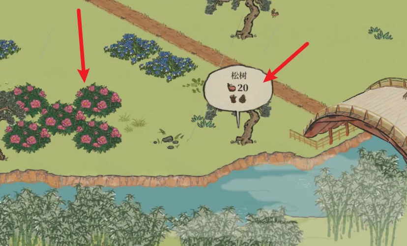 兑换所需的材料均可在丽娘府邸地图内采集获得。牡丹花颜色粉红,生长在绿色的草丛中,在地图各处都比较常见,点击消耗体力即可采集。松果则来源于松树,在丽娘府邸的园子里可以找到松树,点击后同样消耗体力获取松果。这些资源点通常分布在兑换NPC的附近,方便玩家收集。当玩家集齐5个松果和5朵牡丹花后,返回商贩大娘处,兑换选项便会亮起,点击即可购买获得晴山蓝。