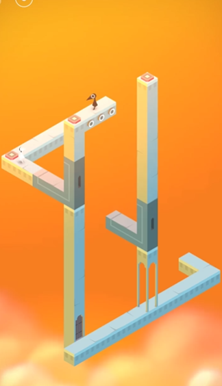 艾达出现后,你操控她沿着出现的道路向左下方行走,转弯并上楼梯,走向那扇开启的门从而进入第二个场景,在新场景中,你需要利用画面上方的一个滑块来控制另一只乌鸦的行动,先将滑块移动到右侧,让乌鸦去踩右边的机关,这会使艾达所站的灰色道路平台发生旋转,当道路旋转到合适位置,连接通向你时,立刻让艾达走到那个L型的灰色道路上去。