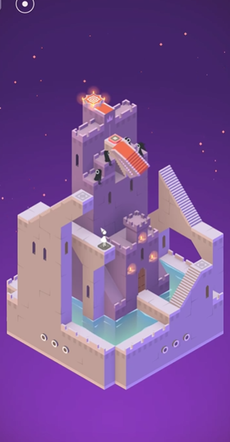 进入新场景后,让艾达去踩她面前的一个机关按钮,踩下去后,旁边带有房间门的城堡会下降,门也随之打开,但当你操控艾达准备走向那扇门时,对面的乌鸦会被惊动并试图走向它那边的机关去关门,为了阻止乌鸦,你需要在艾达离开机关后,快速向下拉动画面下方一个带有三个圆点的缀体或横条,使一块地面升起挡住乌鸦的去路,这样艾达就能顺利进入打开的房间门。艾达进入房间后,会来到一个屋顶并进入另一扇门,与里面的蓝色精灵互动后来到一个紫色城堡场景,这是最后的解谜部分,你需要通过旋转整个城堡来找到通路,首先向左侧转动城堡,让艾达能沿着出现的红色楼梯走上去,然后再次向左侧转动城堡,让她继续登上楼梯的顶端,之后根据情况顺时针或逆时针转动城堡,让艾达去踩特定的机关按钮以启动升起的台阶或平台,最终引导她走到最高处的终点,即可完成本关。