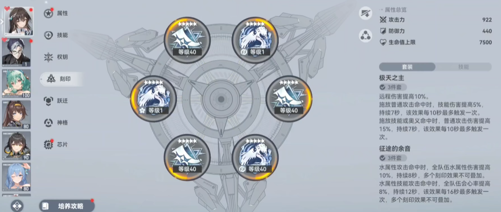 天卫·海姆达尔的培养曲线相对平滑,对新人或资源有限的玩家非常友好。其本体与专属钥从构成的完全体即具备强大战斗力,专武带来的护盾和增益效果对其辅助能力是显著加强。在刻印选择上,主流推荐是携带增加水属性伤害与能量回复效率的组合,具体配置需根据其神格路线进行微调。培养时优先确保其辅助功能的稳定性,即保障技能循环与破甲覆盖,在此基础上再考虑提升其个人输出。