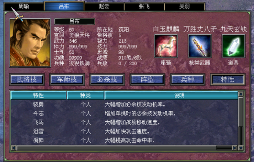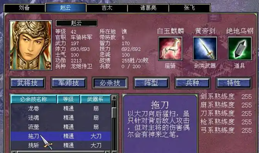 专属必杀技的获得有明确条件,并非武将初始拥有。核心方法是提升武将对应擅长武器的熟练度,当熟练度达到游戏设定的高级阶段后,该武将便会领悟其专属必杀技。张飞、吕布、赵云等枪系武将,需要将枪系武器的熟练度修炼到一定程度才能获得各自的专属技能。一个重要的限制是,专属必杀技只有在武将装备其擅长的武器类型时才会在战斗中触发,如果张飞拿着剑类武器,他的黑风天煞就无法使用,其他武将也是如此。