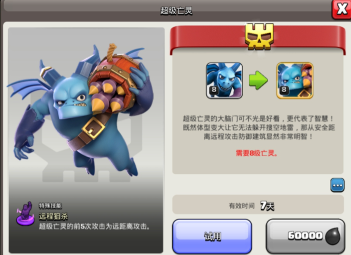 使用亡灵时需要特别注意其生命值偏低的特点,面对多个防空火箭时一定要分批投放,避免被一波防空火力全灭。由于气球炸弹会追踪攻击亡灵,可以先派出单独的几只亡灵去引爆隐藏的气球炸弹,然后再派出成队的亡灵。作战时需要注意,巨人不能吸引防空火箭的攻击,防空火箭仍会攻击你的亡灵。除了普通的亡灵,游戏中还存在超级亡灵这类强化兵种,超级亡灵适合纯流派使用,其特点是远程攻击和高伤集中输出。超级亡灵的解锁和升级在实验室中进行,可以提升其每秒伤害、生命值以及增强特殊技能的效果。