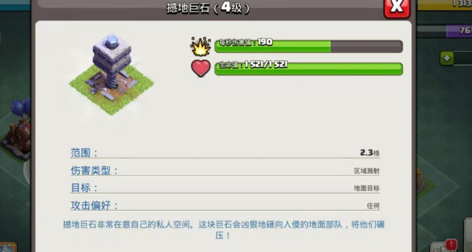 巨石的升级优先级需根据阵型需求调整,日常防守为主时可优先升级至中等等级,保证基础伤害与血量足够应对常规进攻;部落战、联赛等高阶对抗中,需将巨石升至满级,最大化百分比伤害数值,提升对敌方英雄与核心前排的克制能力。升级后的巨石不仅伤害提升,血量也会大幅增加,能更持久地抗伤,配合周边防御形成更稳固的核心防线,面对多种流派进攻时都能发挥关键作用,是高阶阵型中不可或缺的防御核心。