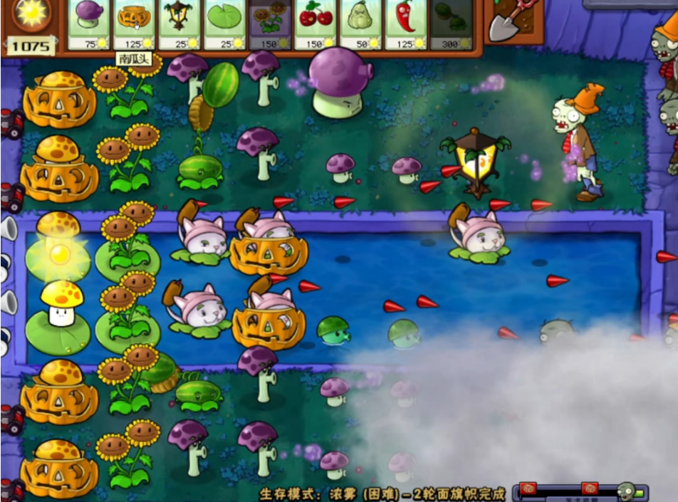 浓雾关卡的核心难点在于视野受限,玩家只能看到有限范围内的植物和僵尸。要顺利通关,必须优先选择能够穿透浓雾或自动攻击的植物,如卷心菜投手、大嘴花、路灯花等。路灯花是必备植物,它能永久照亮周围区域,消除雾气对视野的影响。建议将路灯花种植在中间靠前位置,既避免被僵尸过早吃掉,又能最大化照明范围。