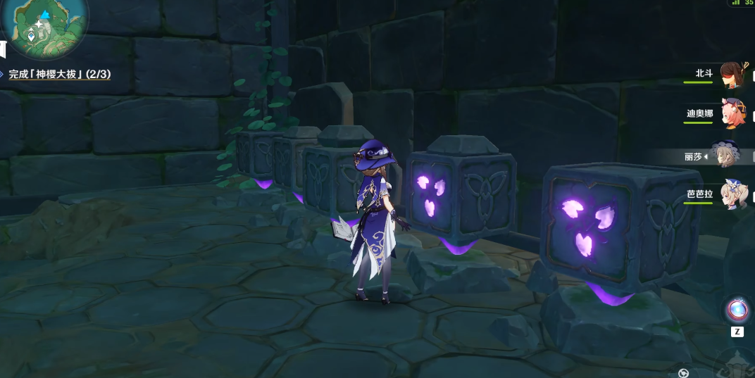 进入井底后,玩家会面临多个雷立方机关的解密。第一个机关位于井底左侧,初始状态下需要攻击右上角的雷立方两下,再攻击左下角的雷立方两下,最后再次攻击右上角的雷立方即可完成解密。解密成功后水位会首次下降,可以跳入出现的洞口继续深入。需若体力不足可在墙壁上稍作休息恢复体力。