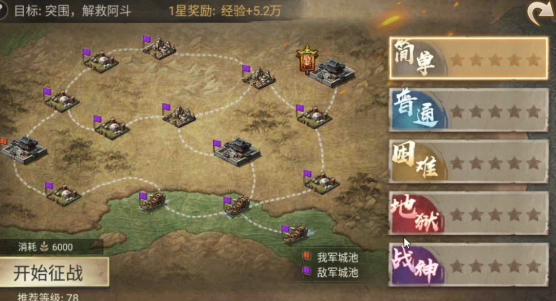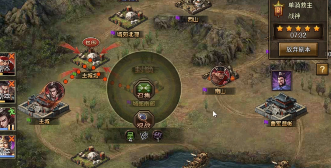 主城无法单挑时,要分派武将去东山和西山拿时间奖励,带阿斗的武将必须留在安全区域。长坂坡事件结束后立即集结部队,等主城熄火的瞬间快速领取所有时间奖励。战神难度下每个区域的敌军数量大幅增加,长坂城南建议刷6-8个影子,曹营水域则需要司马懿带3个影子驻守。