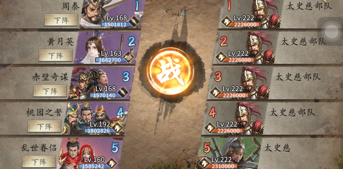打太史慈最关键的就是武将选择和排兵布阵。推荐使用甘宁、马超、黄忠、夏侯惇这套阵容。甘宁要放在第一位,穿朱雀套装,主要用来抵挡敌方战法;马超第三位,穿白虎套装,用来抵挡太史慈的战法;黄忠第四位穿霸下套装,负责输出。如果咱们没有这些套装,也可以用强防、强攻的散装代替,但效果会差一些。记得把甘宁和马超的抵挡属性堆高,这是过关的关键。
