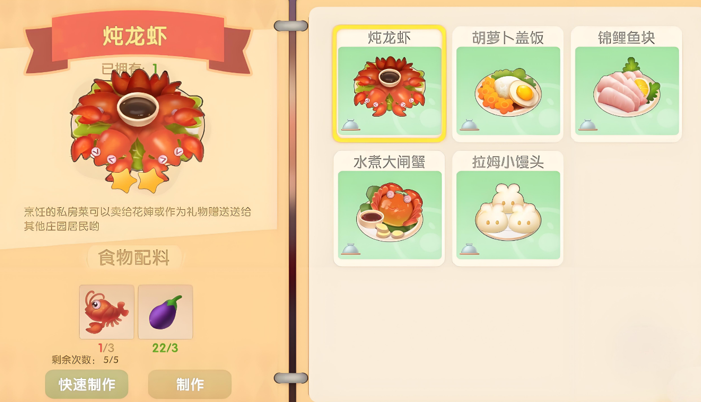 餐厅订单的完成效率直接影响经营收益。首先需要明确订单的查看方式,游戏内订单图标位于右上角,点击后可查看当前所有待处理订单。订单中的菜品通常需要先研究对应菜谱才能制作,研究菜谱需进入餐厅点击炉灶后的机器箱,放入正确材料后即可解锁。部分食材需通过家园种植或钓鱼获取,例如浆果类需在浆果丛林采摘,菌类则需雨天在特定地点采集。