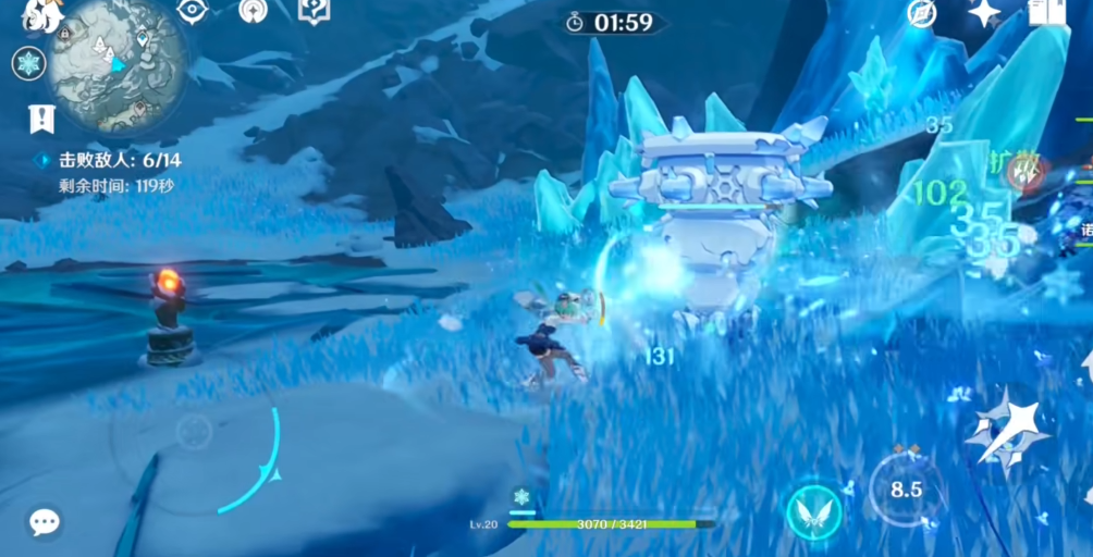 完成准备工作后,就可以开启中央的限时挑战了。挑战要求在180秒内击杀14个敌人,敌人主要是冰属性怪物。前面的怪物相对简单,但最后一波会出现三个冰深渊法师,这是最棘手的部分。建议先用火属性角色快速破盾,然后切换大剑角色进行输出。战斗中要注意走位,避免被多个法师同时控制。如果感觉输出不够,可以提前吃一些增加攻击力的料理。