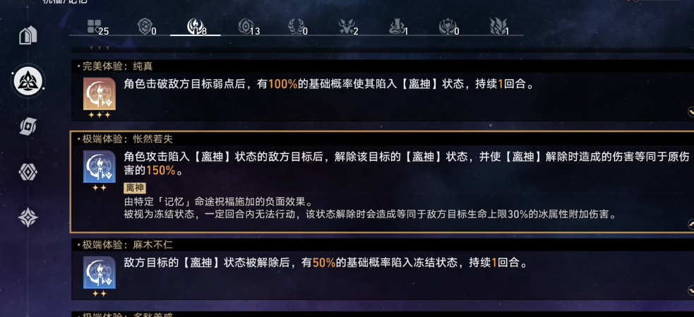 祝福选择以记忆命途为核心,优先获取三星祝福离神·月宴和离神·白夜,前者提升离神触发概率,后者增加解除伤害。二星祝福记忆·纯真可延长负面状态持续时间,强化控制效果。奇物推荐携带福尔图娜的筹码增加祝福获取机会,或混沌契约提升生存能力。进入第五层休息区时务必激活命途回响记忆的浮沫,其群体冻结效果能创造安全的输出环境。祝福强化应优先作用于离神相关效果。