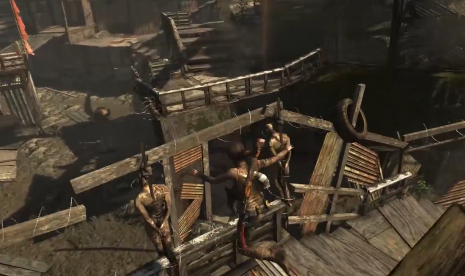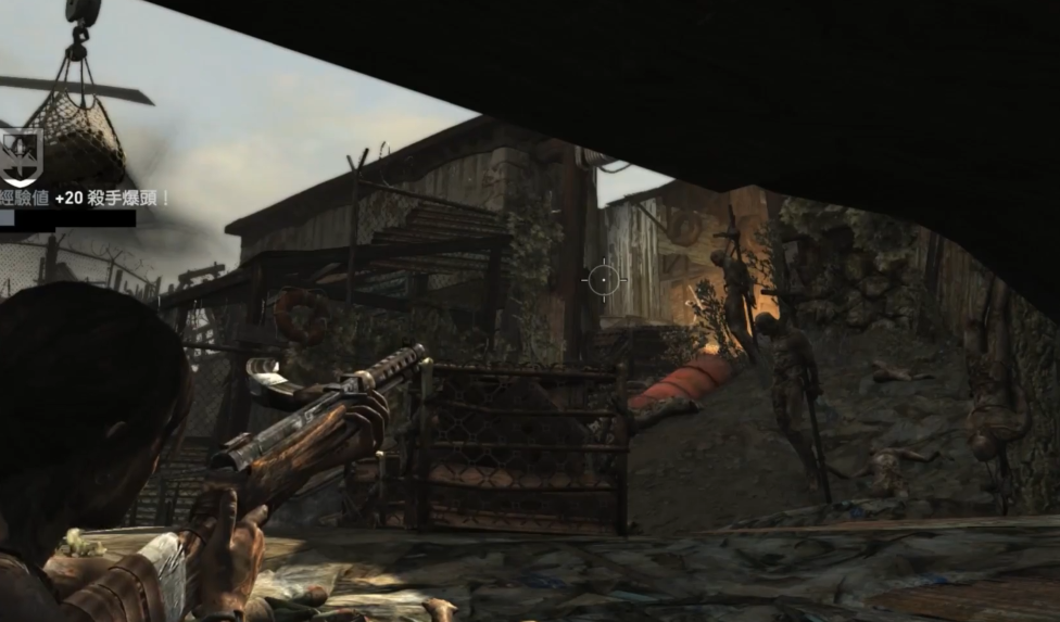 转角处会遇到持冲锋枪的敌人,解决后记得用绳索把飞机甲板拉下来。战斗时敌人会通过绳索滑行接近,抓住他们滑行时的时机射击能事半功倍。往下射击敌人脚下的汽油桶可以引发爆炸,对面敌人身边的油桶也要合理利用。清理完敌人后往右走能找到营火回复状态,这时开启生存本能查看目的地路线,路上会经过第四个古墓的入口。