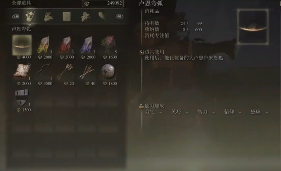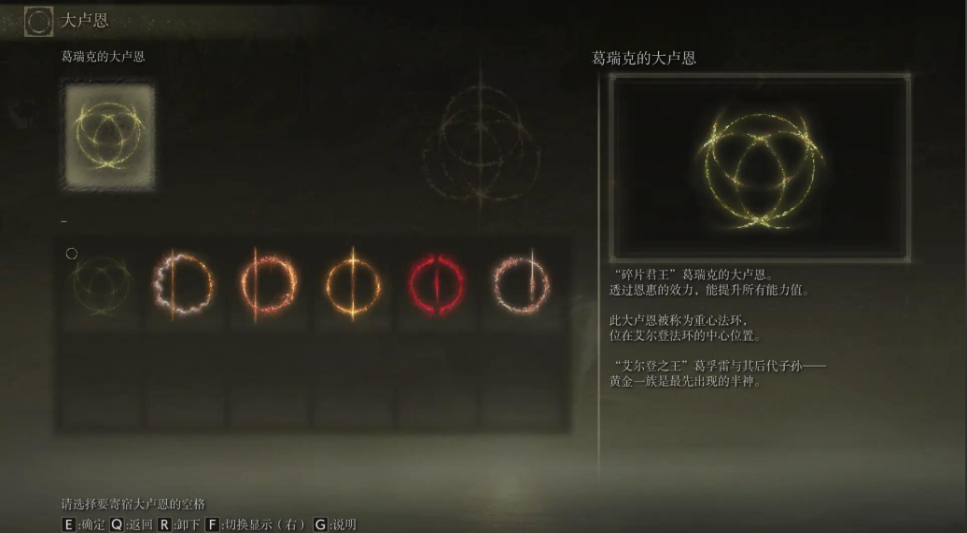 装备大卢恩需在赐福点界面选择大卢恩选项,同一时间仅能装备一个,效果无法叠加。卢恩弯弧可通过联机协助他人击败BOSS、探索地图拾取或从商人处购买获得。不同大卢恩的效果各异:葛瑞克的大卢恩提升全属性5点,拉卡德的大卢恩提供击杀敌人恢复血量效果,蒙葛特的大卢恩则增加25%最大生命值。需根据战斗需求选择装备。
