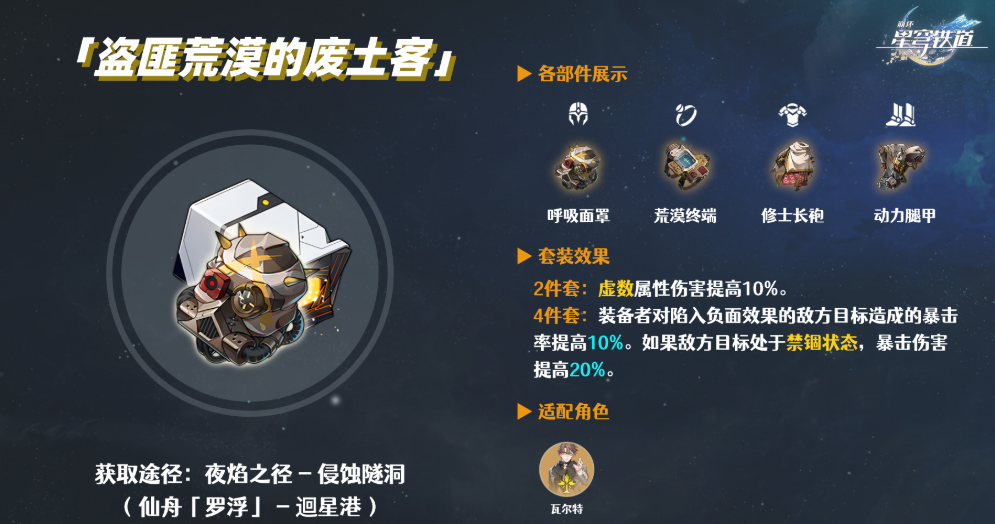 遗器选择上,前期推荐盗匪荒漠的废土客四件套强化虚数伤害与效果命中,40级后优先刷取金色遗器,主属性选择速度鞋、能量回复链及暴击/效果命中衣。光锥首选专武以世界之名,次选四星猎物的视线或晚安与睡颜,前者提升控场稳定性,后者增强对负面状态敌人的输出。若资源有限,三星渊环可作为过渡,其减速增伤特性与瓦尔特完美匹配。