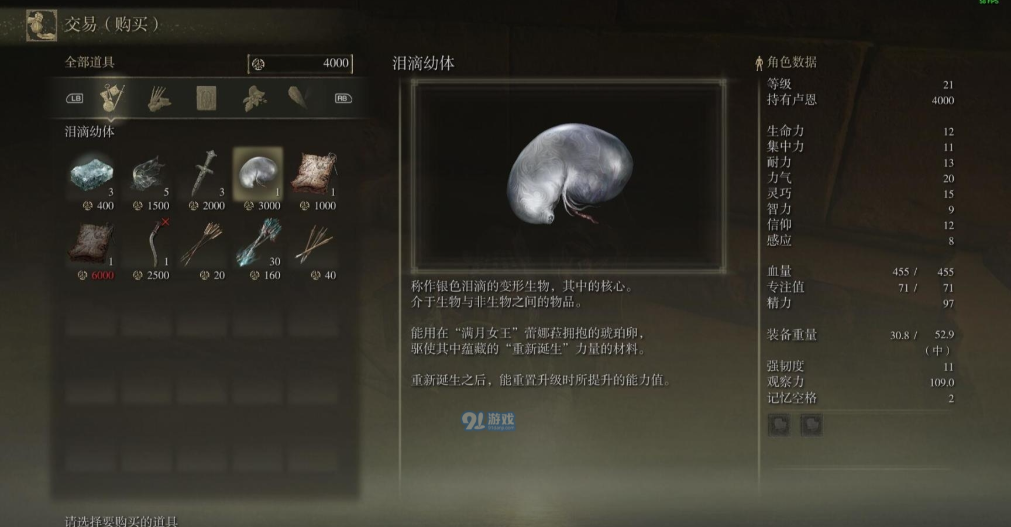 地下世界也有商人卖泪滴幼体,价格是3000卢恩。从希芙拉河入口进去,顺着梯子往上爬,清理掉路上的小怪,最后在桥上就能找到这个商人。如果不想花钱,白金村附近也能捡到免费的泪滴幼体,具体位置在传送点旁边的墓地处。